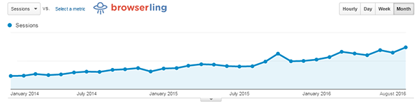 August 2016 was another new visitor and customer high for Browserling. (Excludes webcomic traffic.)